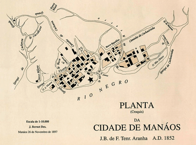 A cidade de Nossa Senhora da Conceição da Barra do Rio Negro, como então se chamava, pois só será denominada de Manáos, em 1856, possuía quatro bairros: a cidade, da ilha de São Vicente, onde estava o Hospital Militar até o igarapé do Espírito Santo, a Avenida Eduardo Ribeiro, depois de aterrado; Campina, ao longo do Caminho da Cachoeira Grande, hoje Avenida Epaminondas, até o inícioda atual Constantino Nery; República, entre os igarapés do Espirito Santo e o do Aterro, e do Caminho da Cachoeirinha, atual Avenida 7 de Setembro e Remédios, além do Igarapé do Aterro, sobre o qual foram construídas as Avenidas Floriano Peixoto e Getúlio Vargas, ao qual se tinha acesso por diversas pontes ou de catraia.