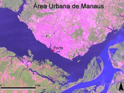 Além do Mapa publicamos uma foto da cidade atual de satélite, em que a parte do mapa de 1852 é o ponto vermelho, à margem do rio Negro, na imensidão rosa, junto à palavra Porto, e uma outra com uma vista aérea recente.