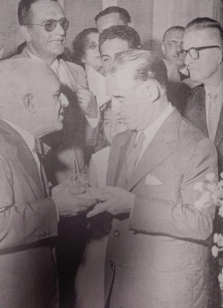 O senhor Presidente da Assembleia Geral da Beneficente, Comendador Agesilau de Araújo, entrega uma lembrança ao General Craveiro Lopes em nome da Diretoria – 1957. Foto: Abrahim Baze/Acervo pessoal