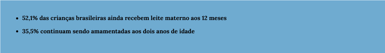 `O Estudo Nacional de Alimentação e Nutrição Infantil (ENANI-2019) revela que cerca de 45,8% dos bebês brasileiros menores de seis meses recebem aleitamento materno exclusivo. Embora esse índice represente avanço importante em comparação com décadas anteriores, ainda permanece abaixo das metas internacionais estabelecidas pela Organização Mundial da Saúde.
