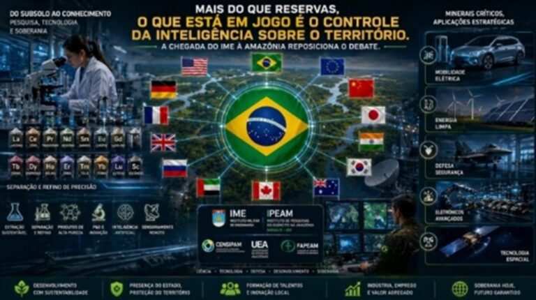 A geopolítica das terras raras chegou ao Brasil pelos ativos. Pode se consolidar pela inteligência. O movimento do IME sugere que essa disputa começa a ser compreendida. Ainda de forma inicial, ainda cercada de incertezas, mas com um elemento que historicamente faltou ao país: a intenção de pensar o território com densidade estratégica.