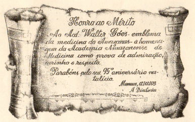 Dr. Walter recebeu inúmeras homenagens em vida pelo seu trabalho na área de Saúde Pública, Educação e Associativa. Em 14 de novembro de 1995, recebeu o Título de Cidadão do Amazonas, concedido pelo Deputado Estadual Humberto Michiles. Um verdadeiro líder a quem o Amazonas será eterno devedor. A seguir, alguns dos registros fotográficos que estão em posse de sua família e que pelo valor histórico das imagens deverão constar neste livro.